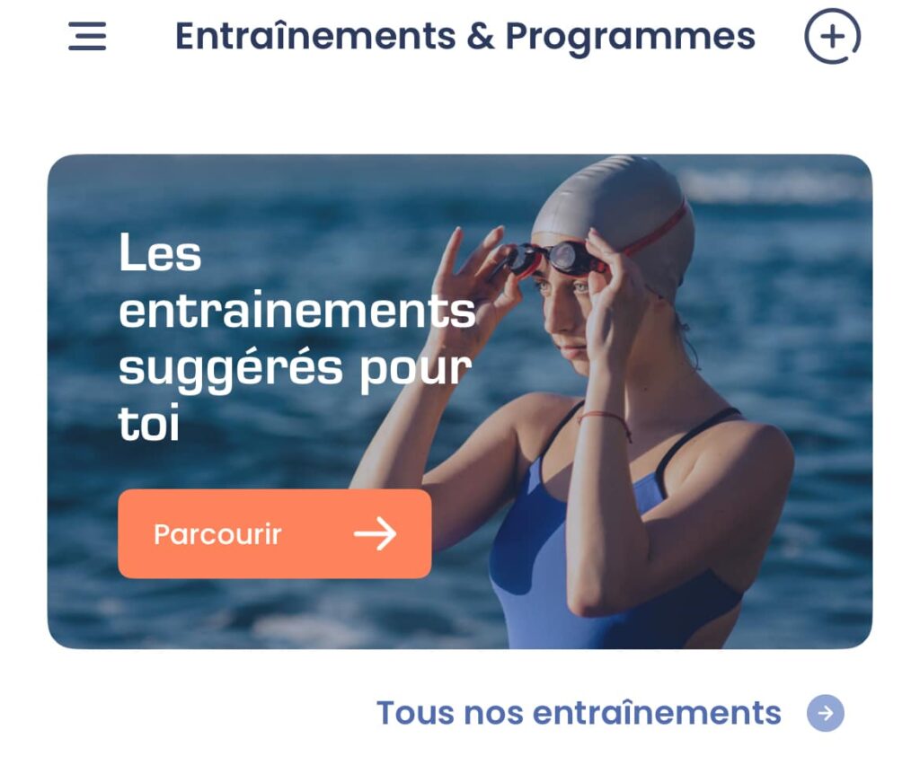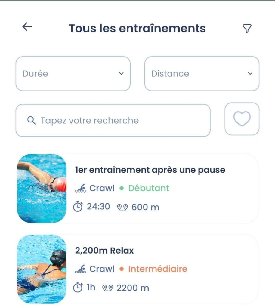 Dorénavant cette section filtre les entraînements que l’on estime intéressant pour vous, notamment selon votre niveau et votre nage préférée. Si besoin, ces filtres peuvent être annulés via la page filtres.